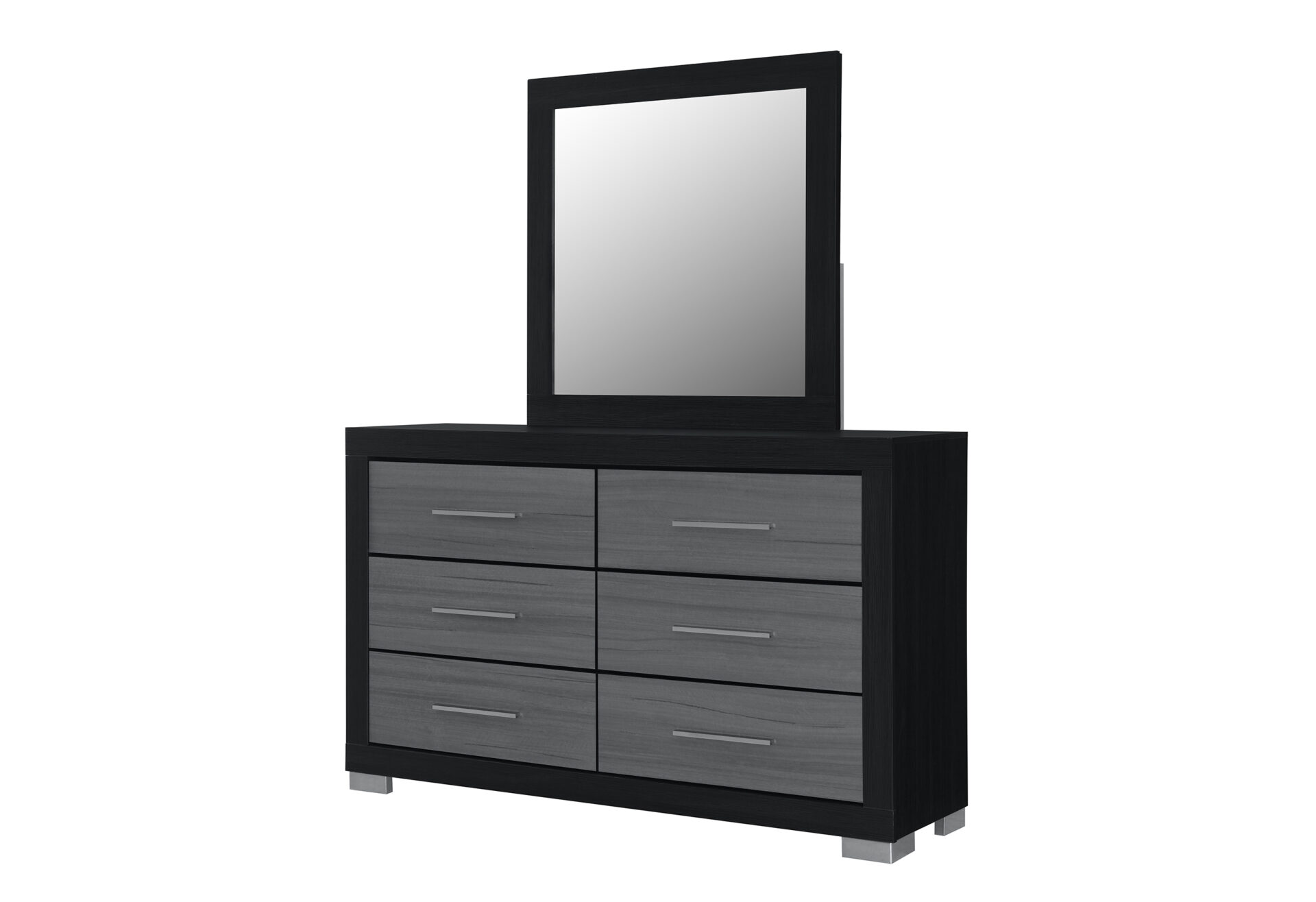 The Emma Dresser adds a touch of sophistication to your bedroom with its sleek two-tone black and grey finish. This dresser features multiple spacious drawers, ideal for storing clothing, accessories, and more. With its clean lines and modern design, it offers both style and functionality, perfectly pairing with other pieces of both the Emma or Madison collections.