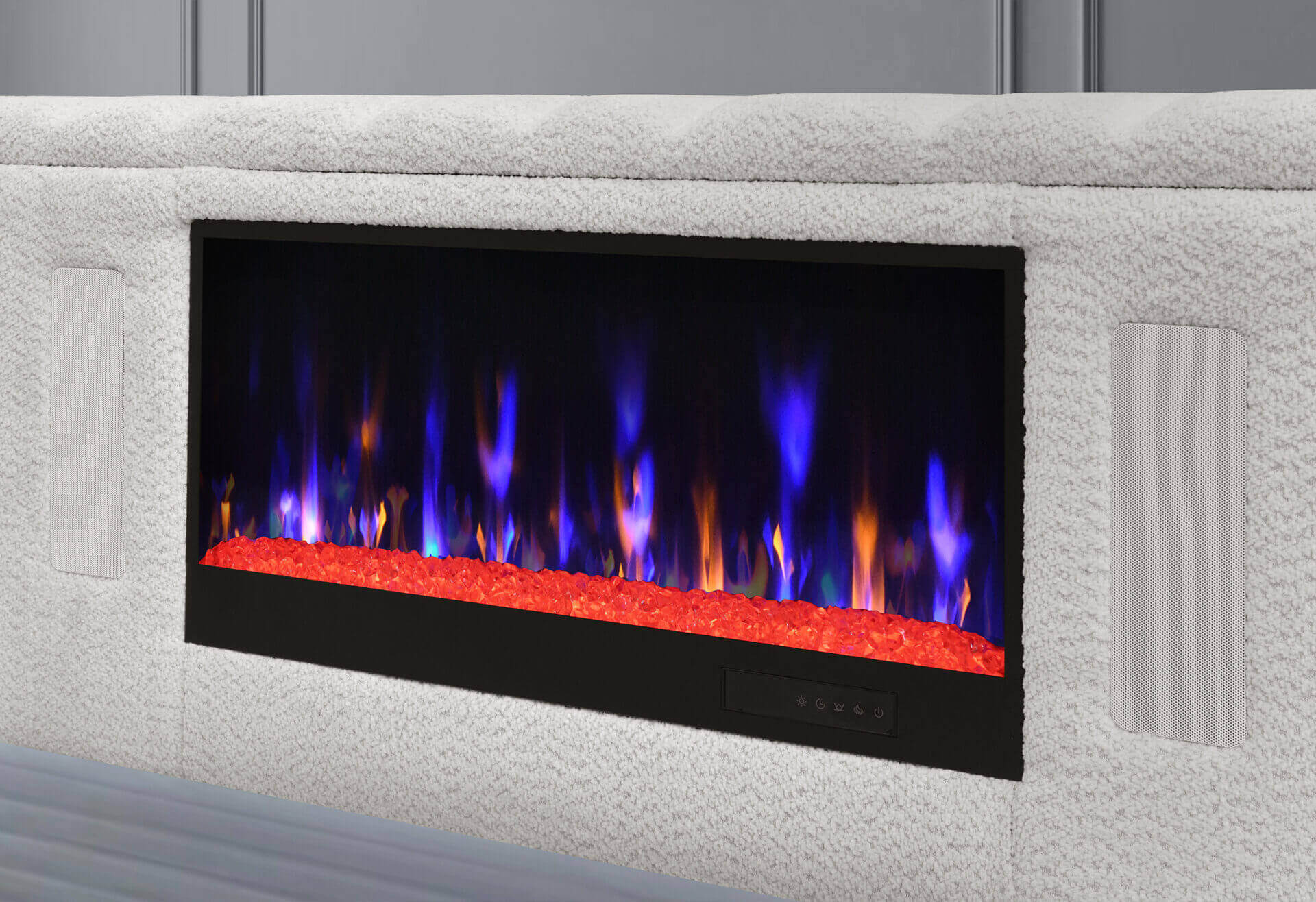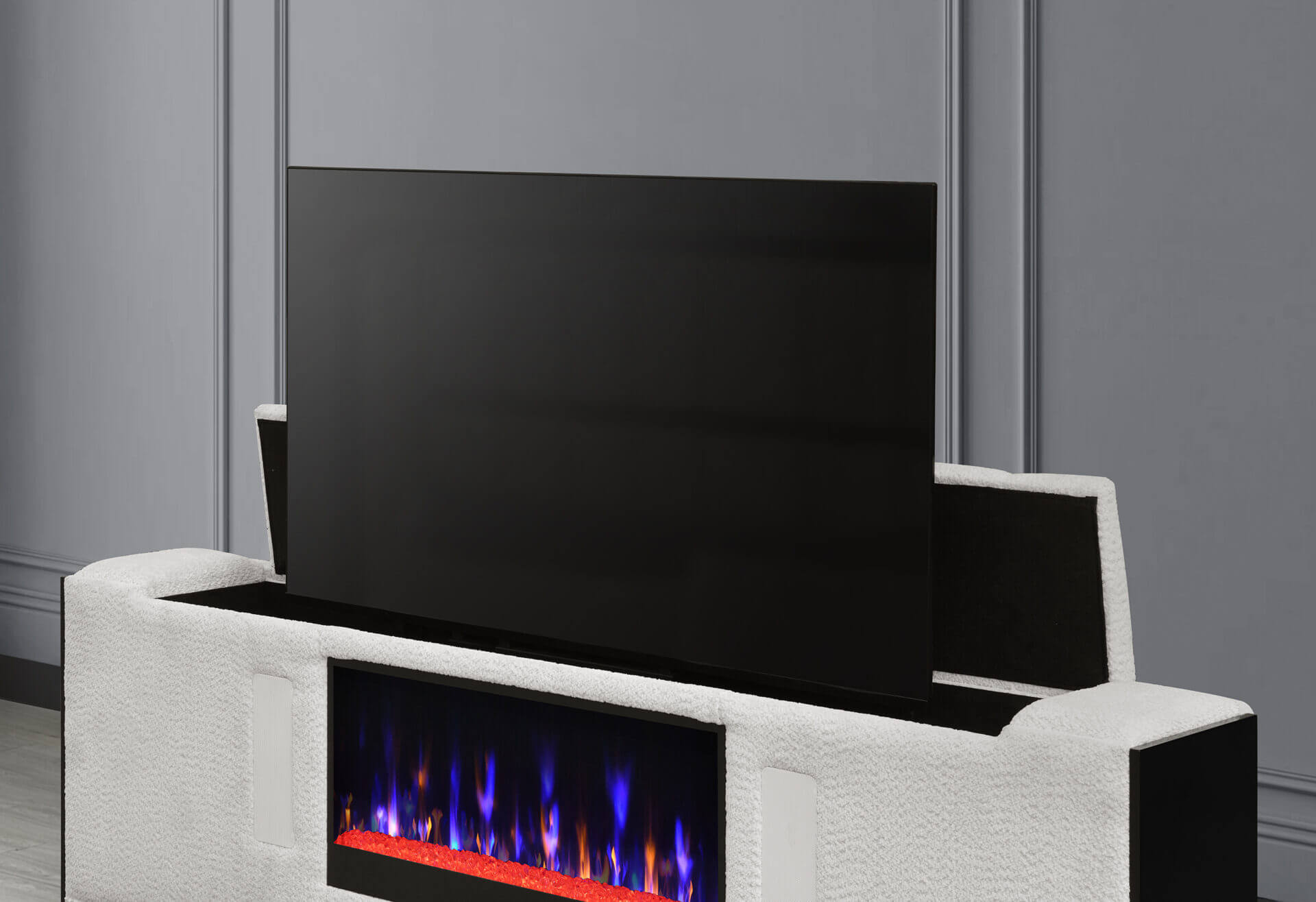 This collection seamlessly blends style and innovation. The dresser, chest, nightstand, and mirror are all equipped with integrated LED lighting, enhancing the ambiance with a subtle, modern glow. The queen bed is the true showstopper—featuring headboard LED lighting, a footboard with a built-in 50″ TV lift, a crystal-insert fireplace, and Bluetooth speakers, all designed to bring comfort and entertainment to the forefront of your bedroom experience.