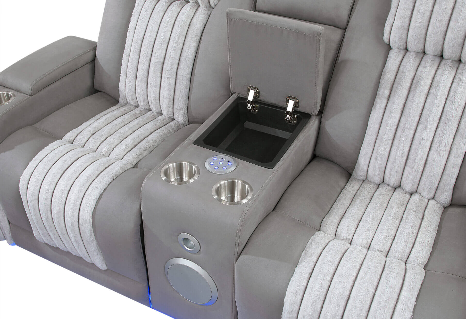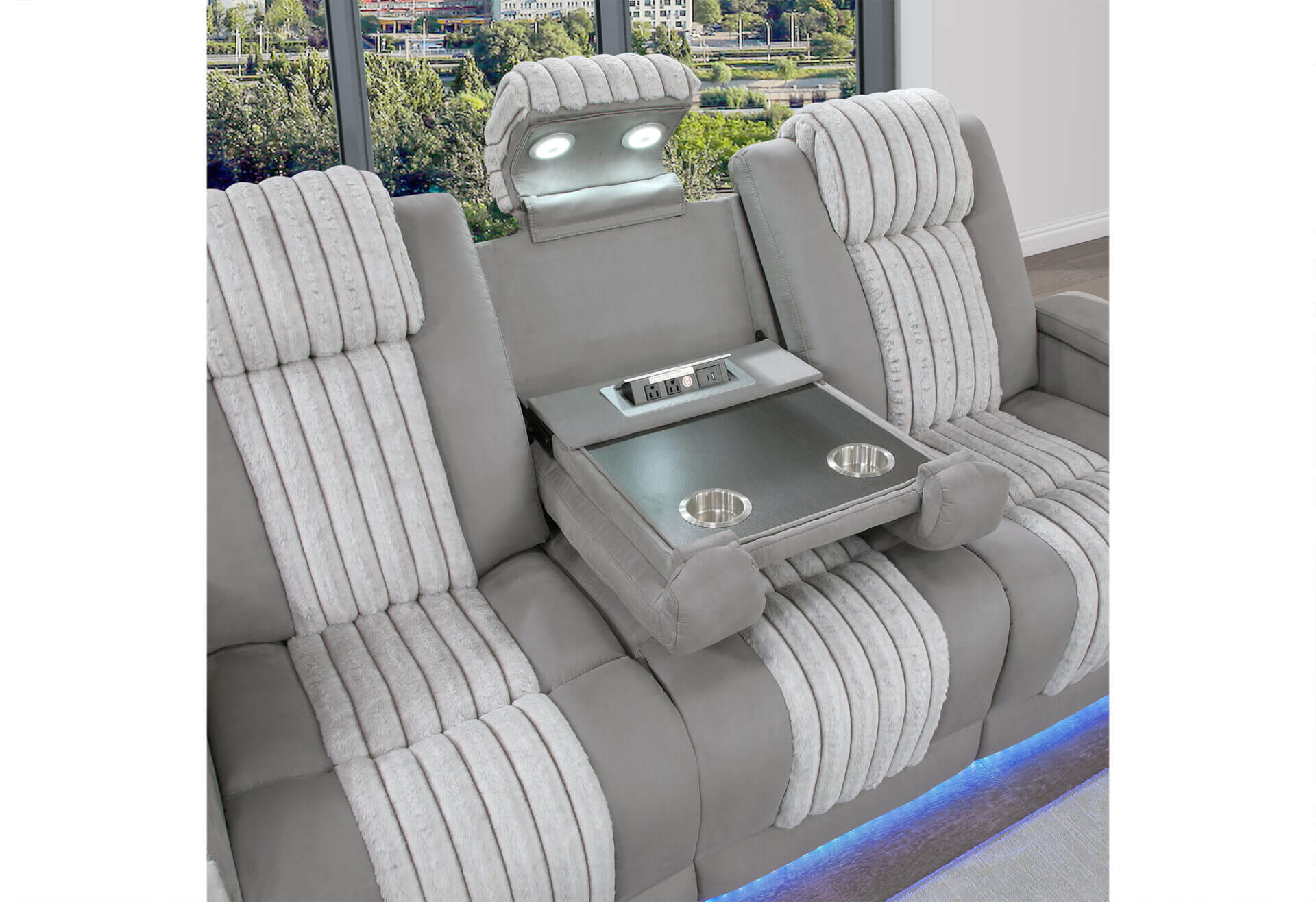 U8000 GREY POWER CONSOLE RECLINING LOVESEAT W POWER HEADREST LED & BLUETOOTH SPEAKER/ POWER RECLINING SOFA W HEADREST DDT TABLE READING LIGHT & LED