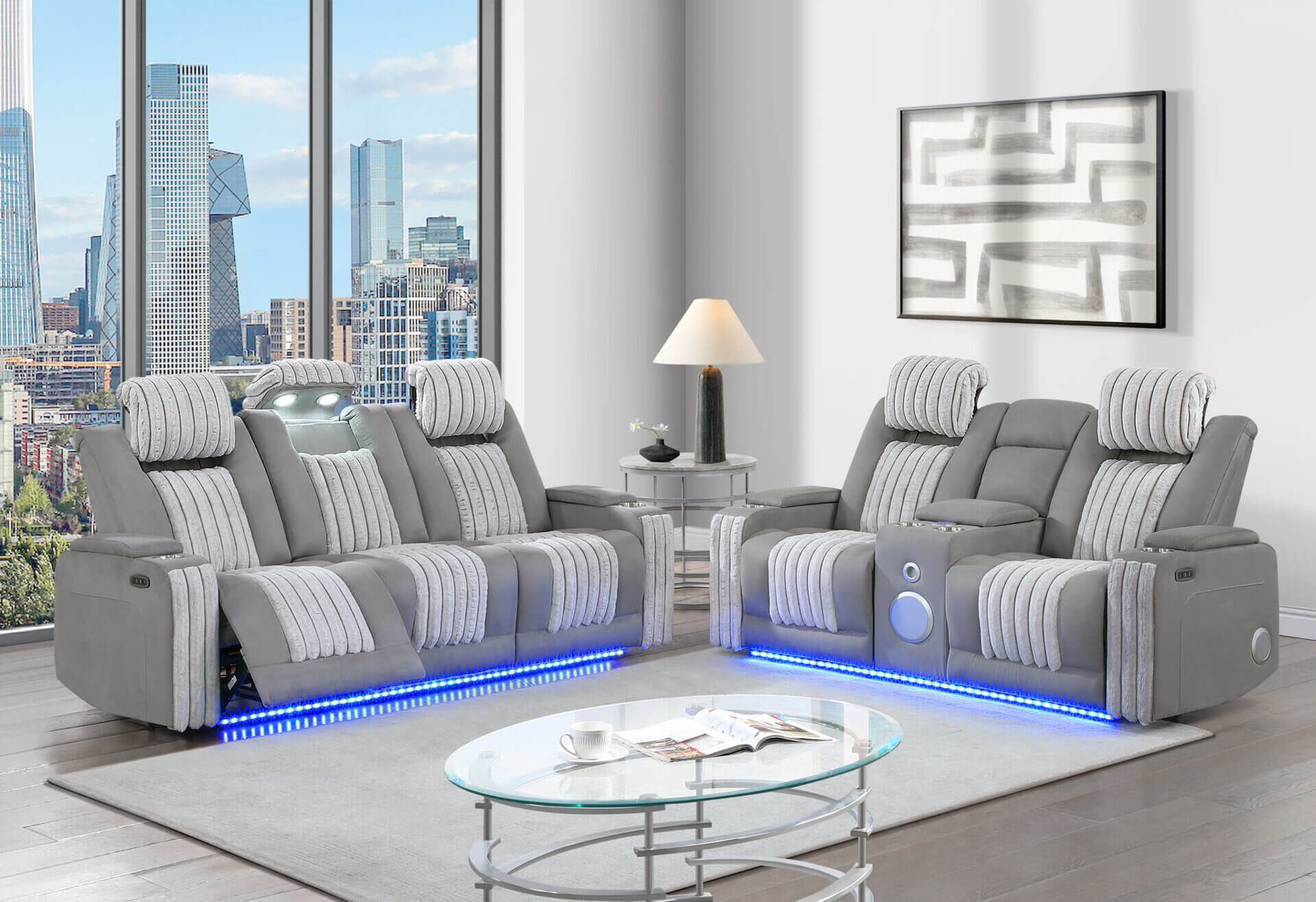 The U8000 Grey Power Reclining Collection combines modern style, smart technology, and luxurious comfort. Upholstered in elegant grey fabric, this set features a power reclining sofa and a power console loveseat, both equipped with power-adjustable headrests and LED ambient lighting for a contemporary touch.