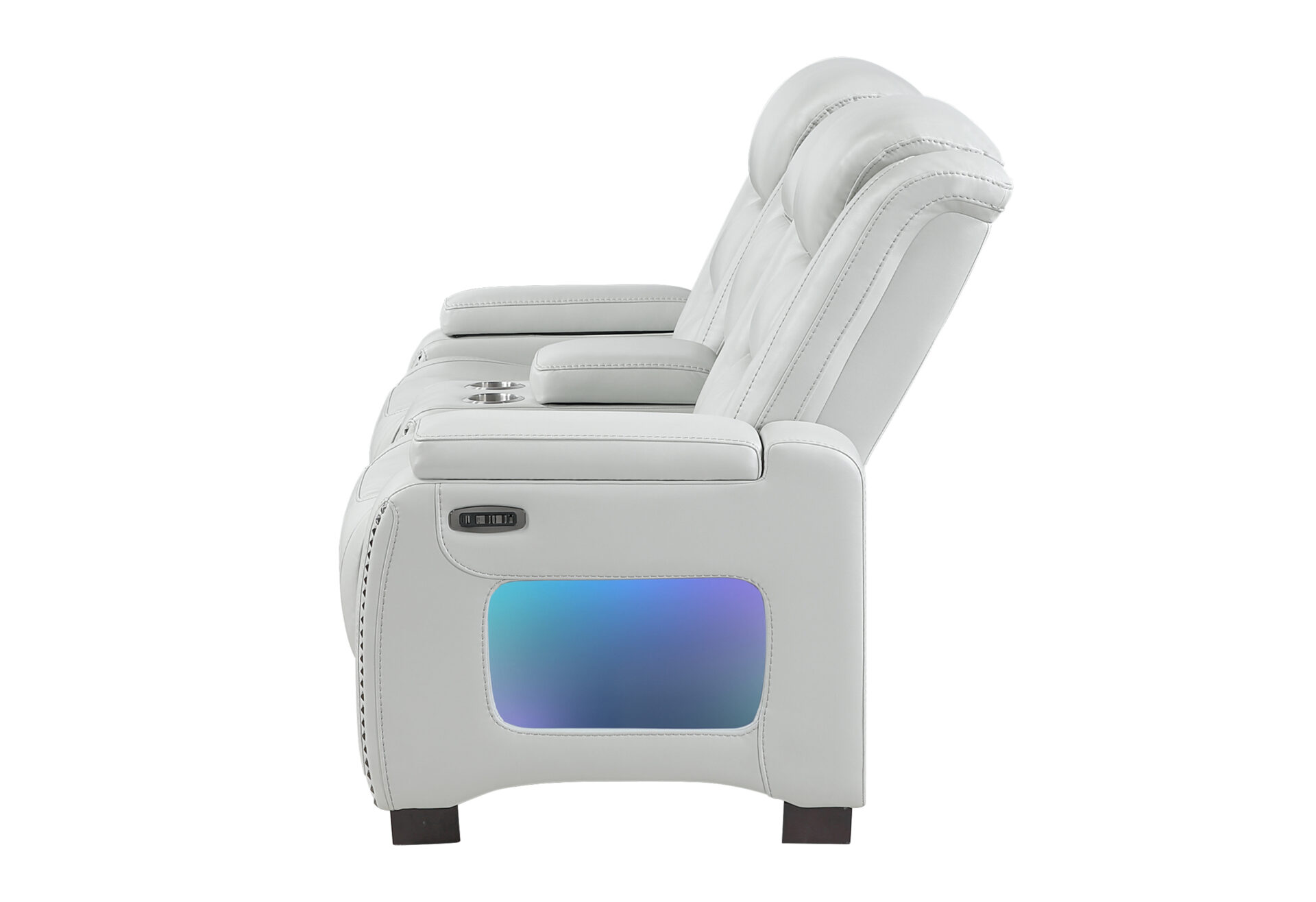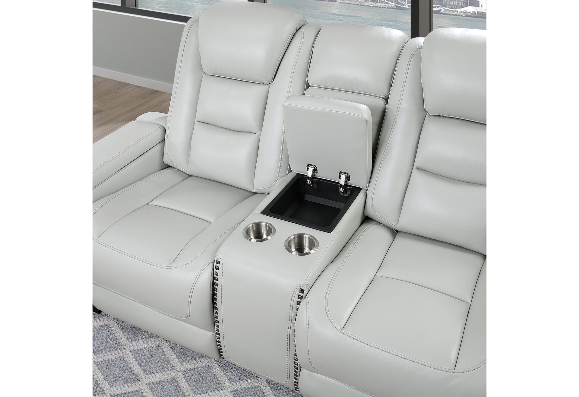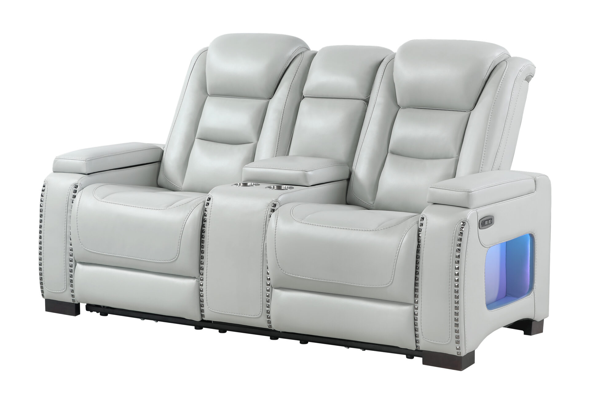 The U8609 Power Console Loveseat blends comfort and convenience in a sleek design. Upholstered in soft blanche silver, it includes dual power reclining and power headrests, plus a center console with storage and cupholders. With USB ports on the power switch, LED-lit side storage, hidden arm compartments, and studded arm accents, this loveseat is the perfect combination of luxury and practicality.