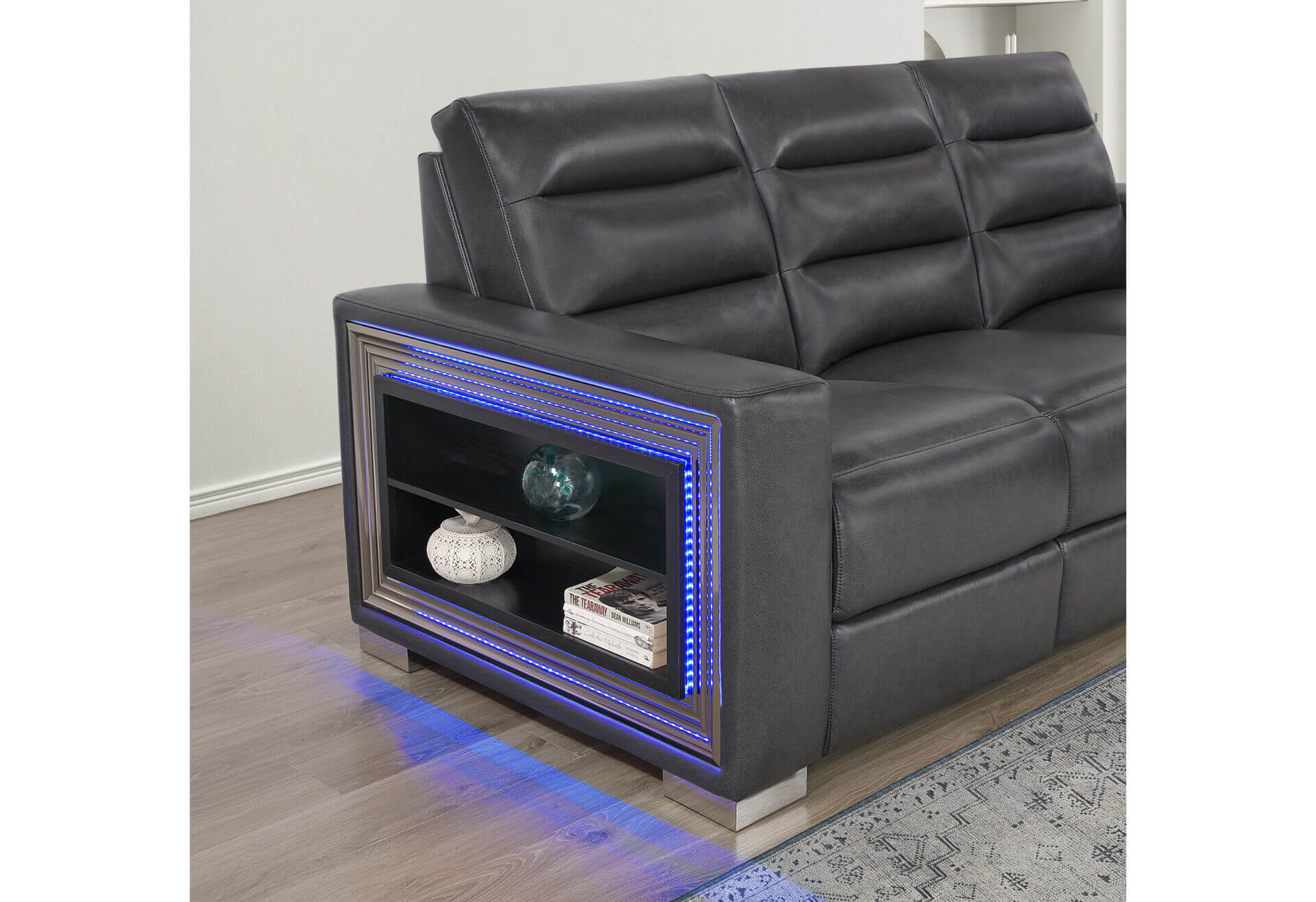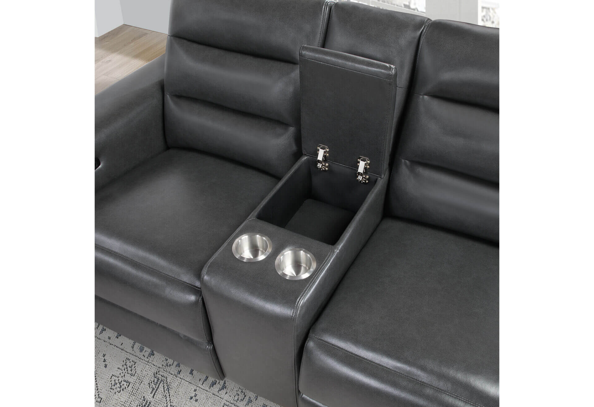 Enjoy adjustable power recline at the touch of a button, built-in USB ports to keep your devices charged, and LED lighting that creates a modern, cinematic atmosphere. The bookcase-style armrests offer convenient hidden storage for books, remotes, or décor, while the power console loveseat adds cup holders and extra functionality for your living space.